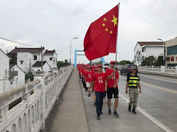 當天雖然秋風瑟瑟,但長時間的徒步仍然讓大家汗流不止,可是不管多累,他們都不曾放慢腳步。領(lǐng)隊更是始終高舉著五星紅旗,昂首闊步走在最前列,成為所有人的方向標。行至一半左右,天空下起了小雨,秋雨夾雜著秋風滴打在人們的臉上。。來自成都公司的魏冬表示,即使路上碰到了刮風下雨,他們也絕不妥協(xié),堅持一步一步堅定的走下去。