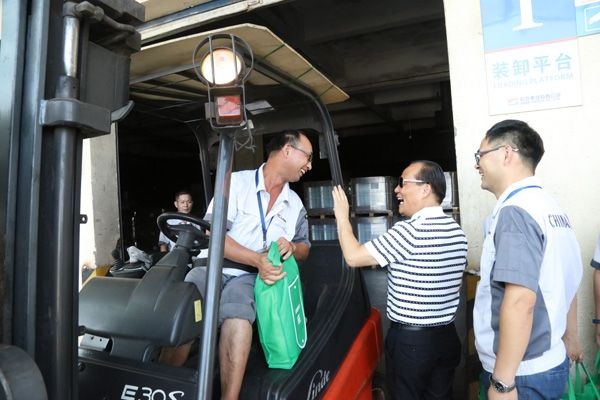在二、三分廠發(fā)貨平臺,張總仔細(xì)觀察倉庫的運作,看到叉車司機(jī)井井有條地將貨物裝進(jìn)集裝箱,張總熱情地和他們打招呼,親切地拍拍他們的肩膀,感謝他們辛苦工作,同時提醒他們注意安全,勞逸結(jié)合,小心中暑。