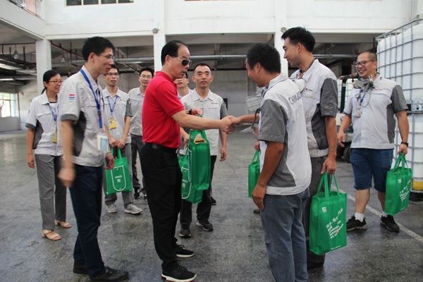張毓強(qiáng)總裁和丁成車副總裁來到二分廠制氈工段,由于是敞開式區(qū)域和烘箱的緣故,這里的溫度很高,工人們干活很辛苦??吹秸谡J(rèn)真干活的工人,張總關(guān)切地問:“怎么樣?熱不熱???”張總一一送上清涼禮袋,不停地說“謝謝你們!辛苦了!”