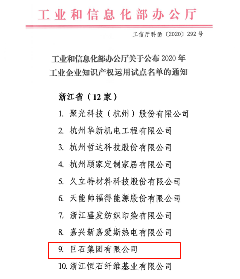 巨石集團(tuán)榮獲國(guó)家工業(yè)企業(yè)知識(shí)產(chǎn)權(quán)運(yùn)用試點(diǎn)企業(yè)