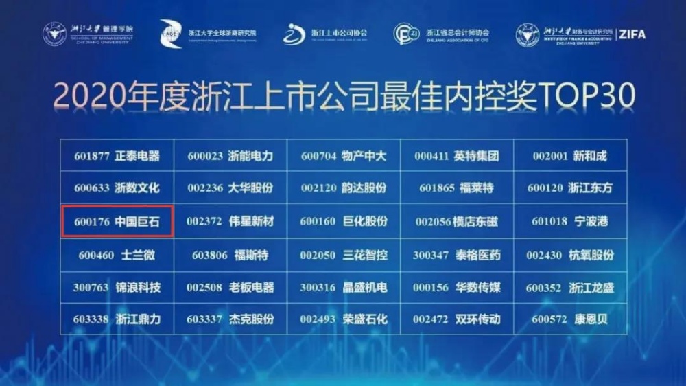 近日,浙江大學(xué)管理學(xué)院/全球浙商研究院、浙江上市公司協(xié)會(huì)和浙江省總會(huì)計(jì)師協(xié)會(huì)、浙江大學(xué)財(cái)務(wù)與會(huì)計(jì)研究所(ZIFA)等機(jī)構(gòu)聯(lián)合舉辦“第五屆上市公司高質(zhì)量發(fā)展論壇暨浙江上市公司內(nèi)部控制指數(shù)發(fā)布會(huì)”。大會(huì)發(fā)布了《2020浙江上市公司內(nèi)部控制指數(shù)報(bào)告》,并向獲得“最佳內(nèi)控獎(jiǎng)”30強(qiáng)的上市公司頒獎(jiǎng)。中國(guó)巨石榮獲2020年度浙江上市公司最佳內(nèi)控獎(jiǎng)第11名。