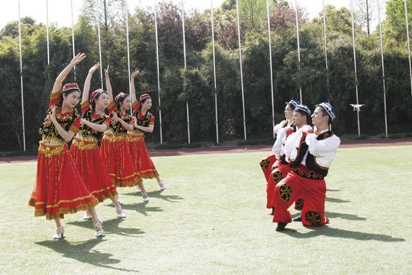 珠纓旋轉(zhuǎn)星宿搖,花蔓振作龍蛇動(dòng)。綠茵場(chǎng)上,姑娘們隨著動(dòng)感的節(jié)奏舞動(dòng)身姿,時(shí)而化身成達(dá)坂城的姑娘翩翩起舞,時(shí)而化身青春洋溢的正能量少女,旋轉(zhuǎn)、跳躍。下午的陽(yáng)光照射在姑娘們的身上,熱情與汗水肆意揮灑,練習(xí)多日的舞蹈在這一天盡情展現(xiàn)。
