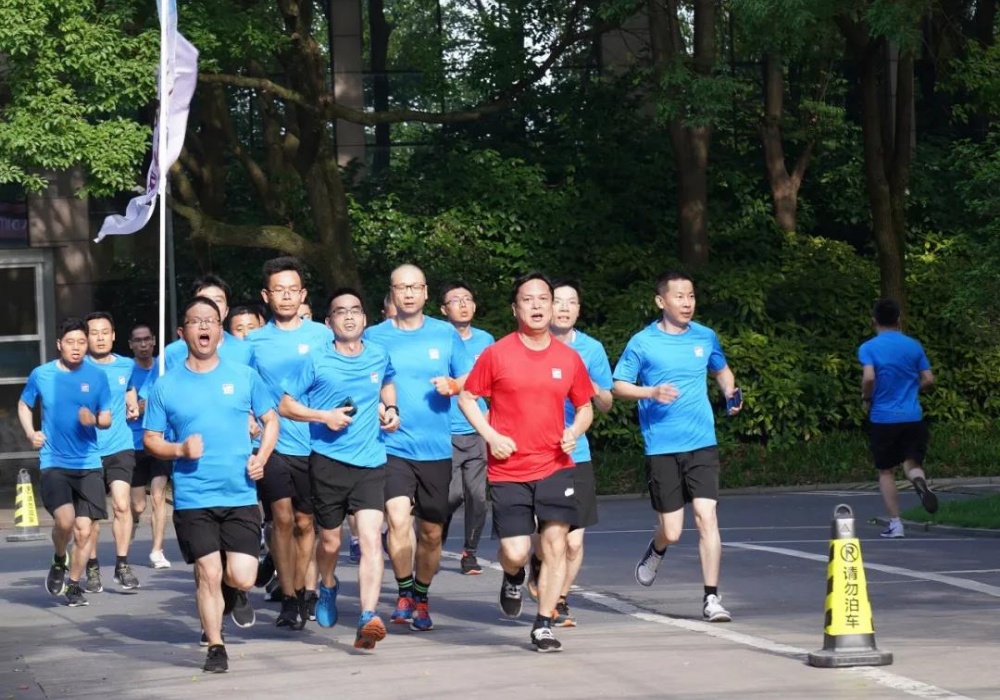 健跑隊伍以公司體育中心為起點,繞著塑膠跑道和科技大樓跑完整整3圈,雖然汗水早已濕透了衣衫,但臉上依舊面帶笑容,堅持著跑到終點。