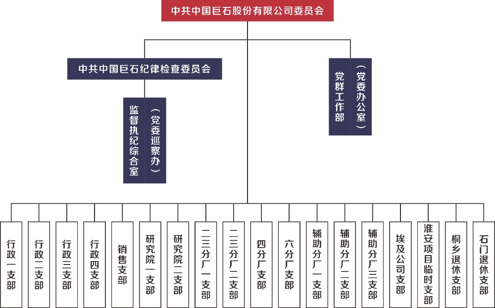 中共巨石集團(tuán)委員會成立于1996年4月,2015年12月更名為中共中國巨石委員會。公司黨委領(lǐng)導(dǎo)班子健全,總裁楊國明擔(dān)任黨委書記,黨委副書記:邵曉陽,黨委委員:曹國榮、丁成車。黨委下設(shè)19個(gè)黨支部,各設(shè)有支部書記、組織委員、宣傳委員、紀(jì)檢委員等?,F(xiàn)有黨員630人,其中正式黨員620人,預(yù)備黨員10人。中層及以上干部黨員人數(shù)為328人,女黨員103人。碩士以上學(xué)歷57人,其中博士6人。