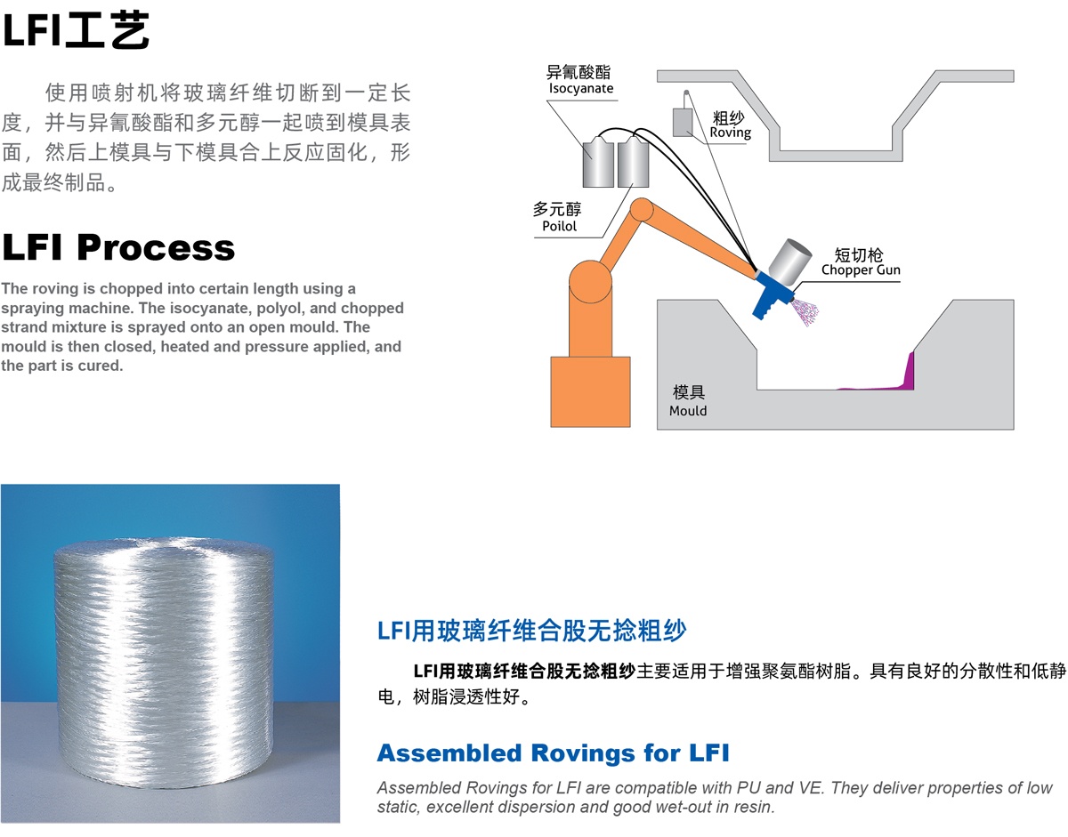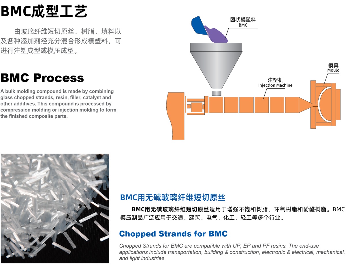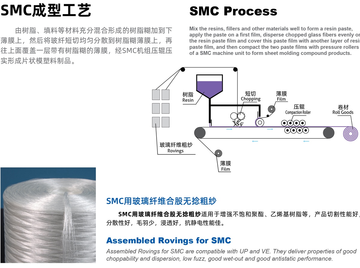 | 440 | 短切分散性好,模壓流動性好制品機械強度高 Excellent choppability and dispersion, good mold flowability,high mechanical strength of composite products | 門皮、汽車部件 Door skins, automotive parts |