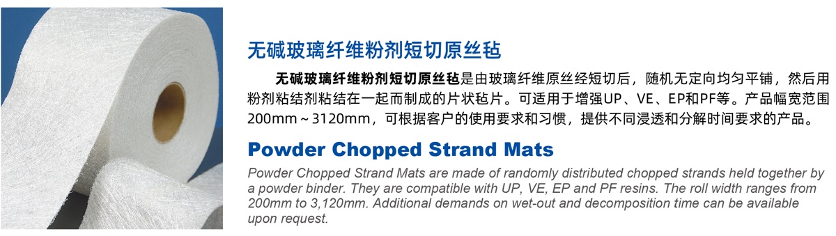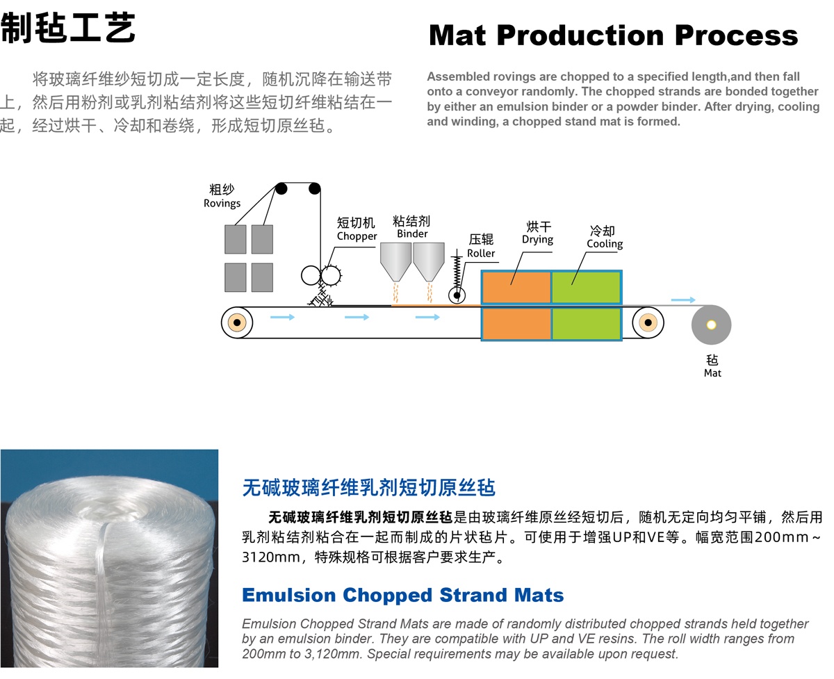 E20 | 覆模性好,樹脂浸穿性好,浸透速度快,氣泡容易排除,減少輥壓次數(shù), 樹脂消耗少,制品機(jī)械強(qiáng)度高,優(yōu)異的耐酸腐蝕性 Good moldability, good wet-through and fast wet-out in resins, rapid air lease reducing rolling out times and increasing productivity, low resin consumption, high mechanical strength of composite products, superior acid corrosion resistance |